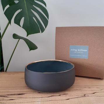 Inspired by the clay itself, Aisling "Slate" range highlights the difference between the texture of unglazed ceramics, on the outside of the pot, and the smooth teal-hued glaze, on the inside. She makes all her work on the potters wheel with a light coloured clay. After the clay dries a little, it is returned to the wheel to refine the shape. Then layers of black coloured slip, (watered down clay) are added into the surface of the pot. The pots are dried and fired to 1000°C. They are then glazed on the inside and fired again to 1260°C. Some pieces are embellished with a trim of gold lustre which adds an extra element of timeless elegance. These pieces are fired a third time to 750°C.