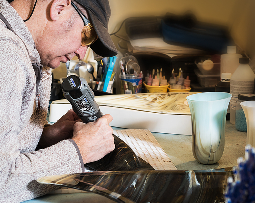 Keith’s focus is on the fine arts and architectural / sculptural potential of kiln formed glass, using more advanced and complex techniques, exploring design, composition and colour theory, with the ability to conceive layers of process and material application.